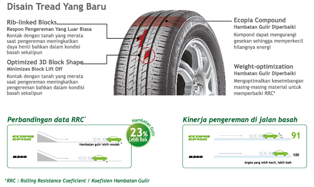 ECOPIA EP150 adalah kontribusi Bridgestone melalui Teknologi terkini menciptakan produk berkualitas dalam : Konsumsi bahan bakar lebih rendah/efisien (hemat biaya) Menurunkan emisi CO2 (Memperbaiki lingkungan hidup dan mencegah Pemanasan Global) Kinerja ban tetap handal (Mengutamakan keselamatan berkendara)